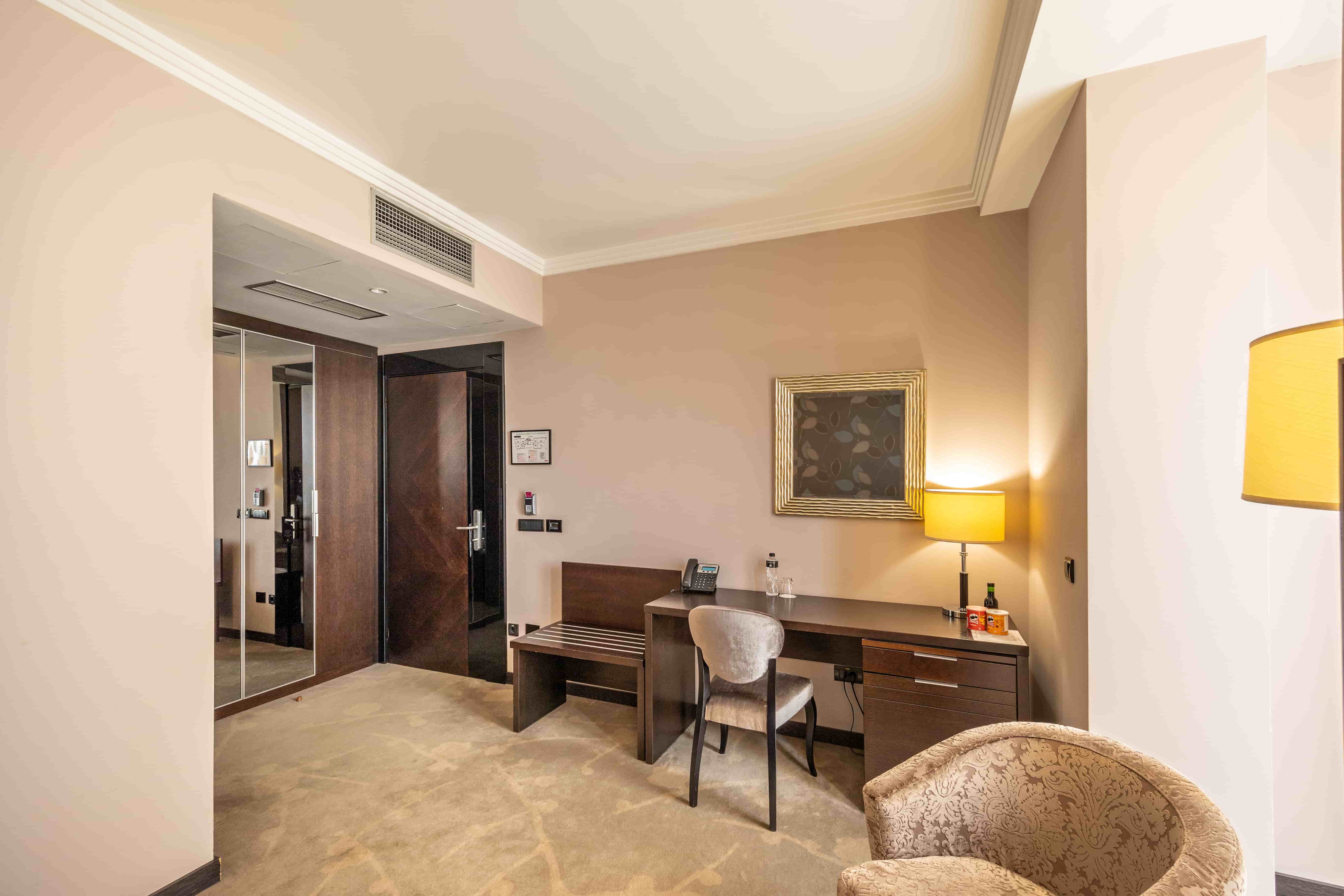 Ova jednokrevetna soba (25m2) je klimatizovana i ima prostor za sedenje, mini-bar i LCD TV sa satelitskim kanalima. Moderno kupatilo ima bade mantil, fen za kosu i bide.
